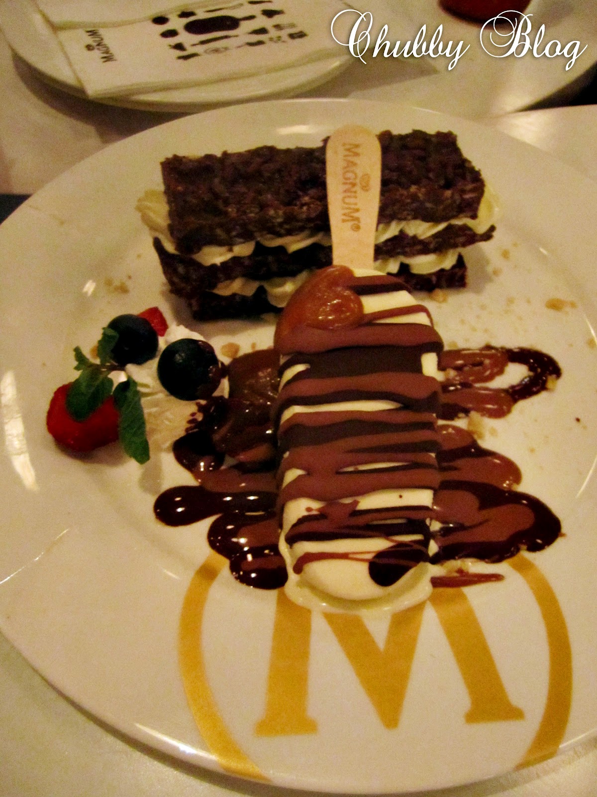 lastly, we had the deconstructed cheese cake.. by saying "deconstructed", it means that all of the ingredients of a cheese cake are prepared separately but presented together, although not in the usual form of a cheese cake.. so what we had that night was three bars of rice crispy with creamy cheese fillings in between and an Magnum ice cream with caramel and chocolate sauce.. it was heavenly.. I love every little details in it.. one of the best and most unique dessert I have ever tasted.. yum yum..